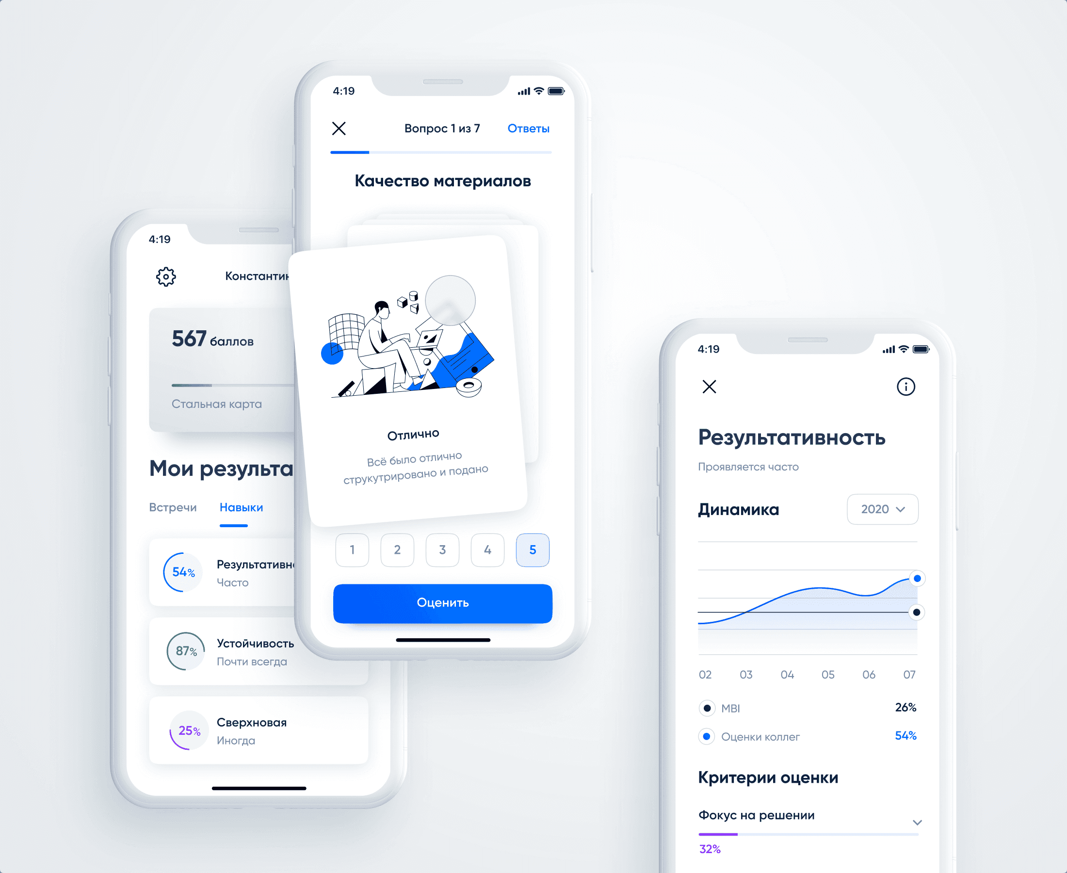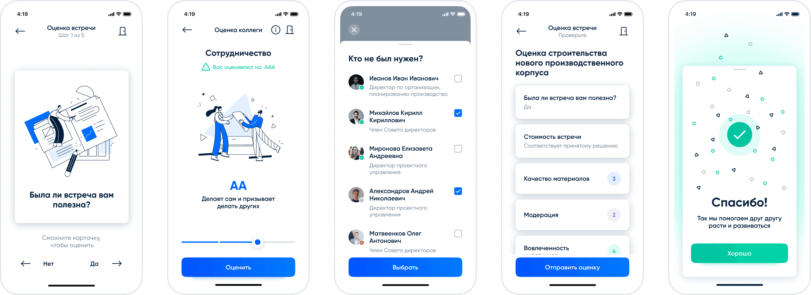 Many user flows in the application were designed with a playful approach, which led to the frequent use of illustrations alongside the main interface elements. We created over 30 unique illustrations specifically for this project. I established the visual style for the illustrations and created the initial ten. Subsequently, a designer who joined the project continued the work on illustrations. Additionally, I animated some of them using After Effects, exporting them to JSON files for integration directly into the interface. For instance, these animations were used to demonstrate the rating when dragging a handle while evaluating a meeting or a person.