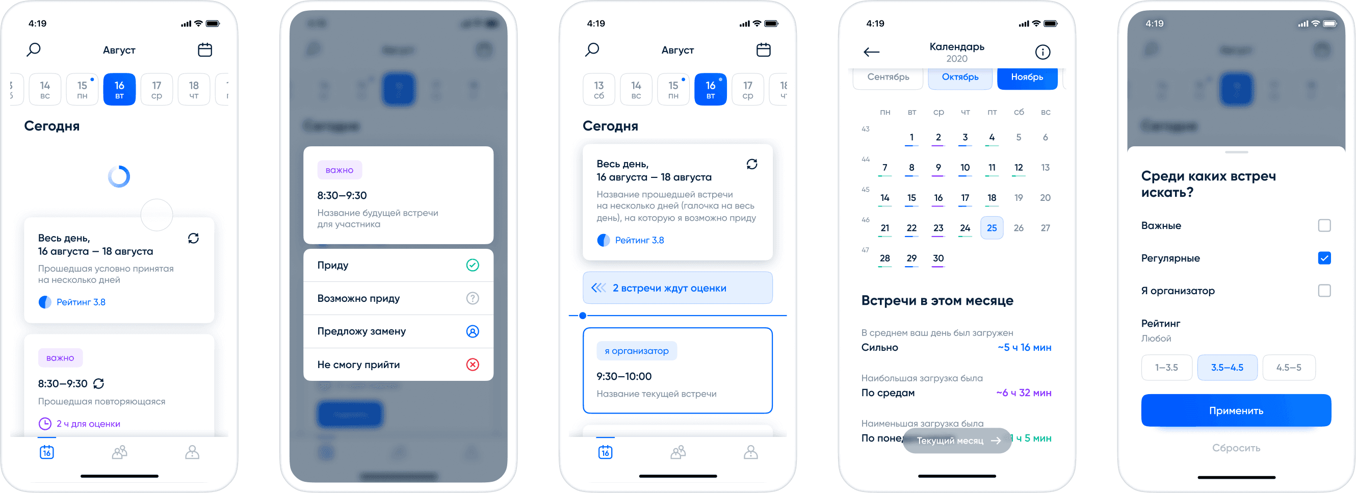 Meetings feed on the main screen, workload calendar and search.