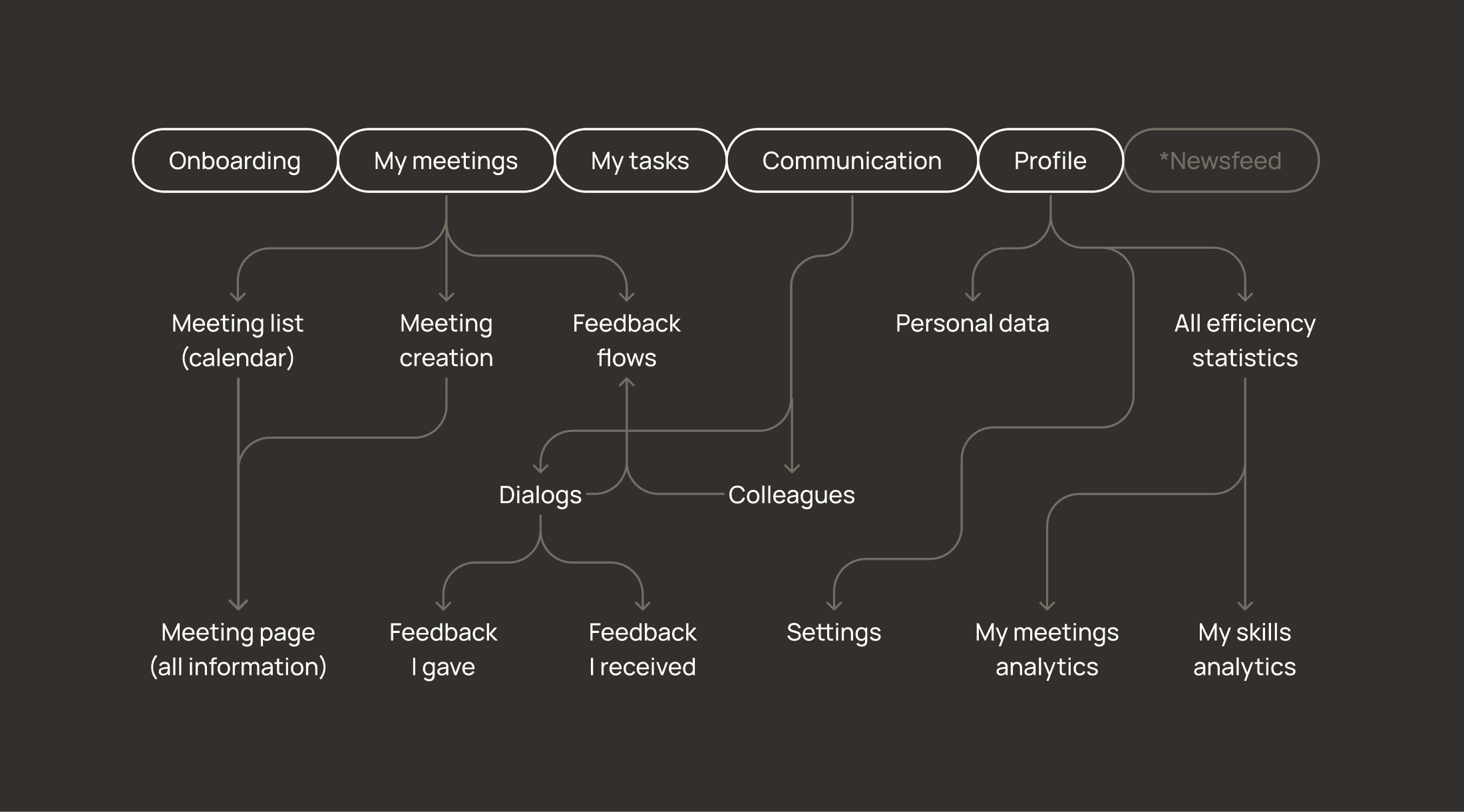 After obtaining all the necessary information in an organized manner, I began creating the navigation structure of the service. In a simplified form, it consisted of the following sections and scenarios: