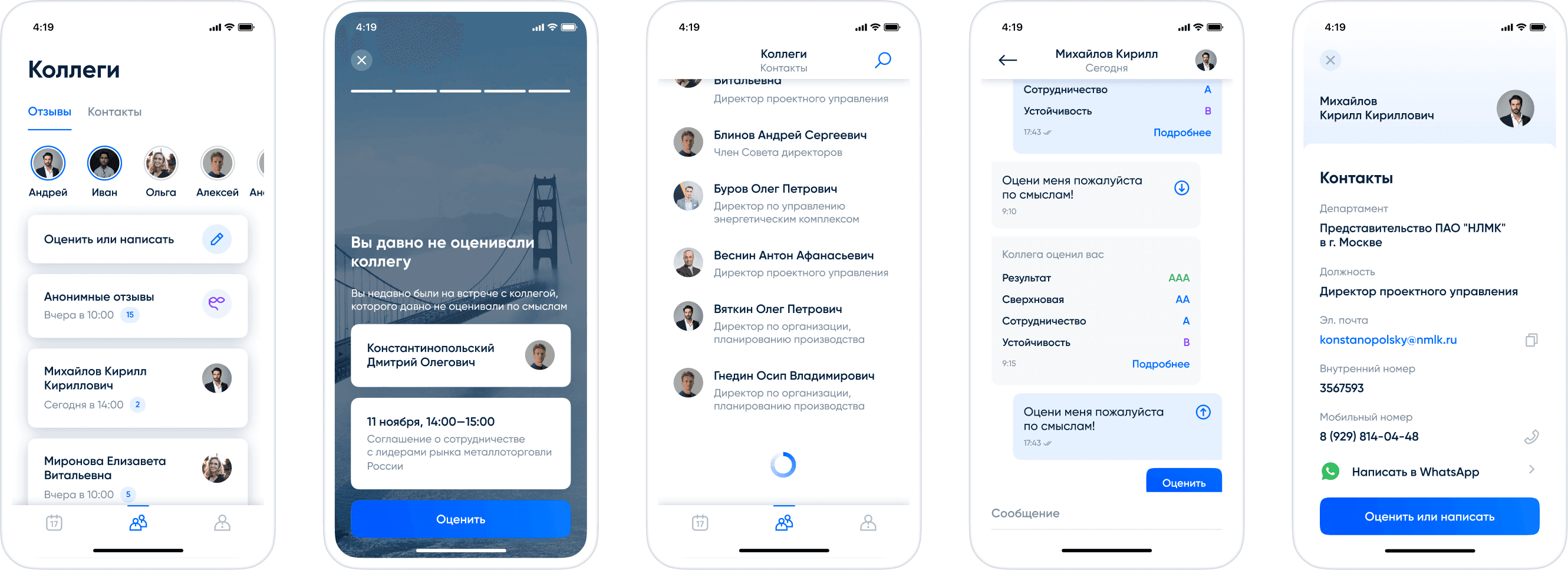 One of the key problems addressed by the application was the lack of a unified contact database for NLMK managers. To tackle this issue, I created a dedicated section within the app where users could find colleagues and access relevant information about them. This section allowed users to initiate conversations and, importantly, rate themselves or request a review from their colleagues.