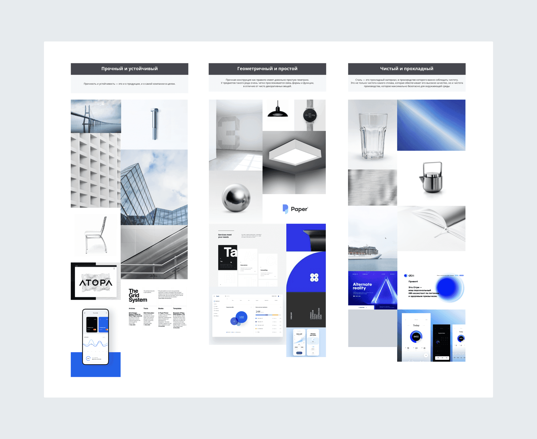 Before I started working on a design concept, I received a brand book from the client (created in 2015), and they also had a corporate website. Based on our previous discussions, we agreed to maintain the new app within the current style boundaries, while also incorporating a fresh and modern touch. They wanted to maintain a serious tone but also wanted to introduce entertaining elements. So, I began with a mood board. I defined three key visual characteristics for the product: