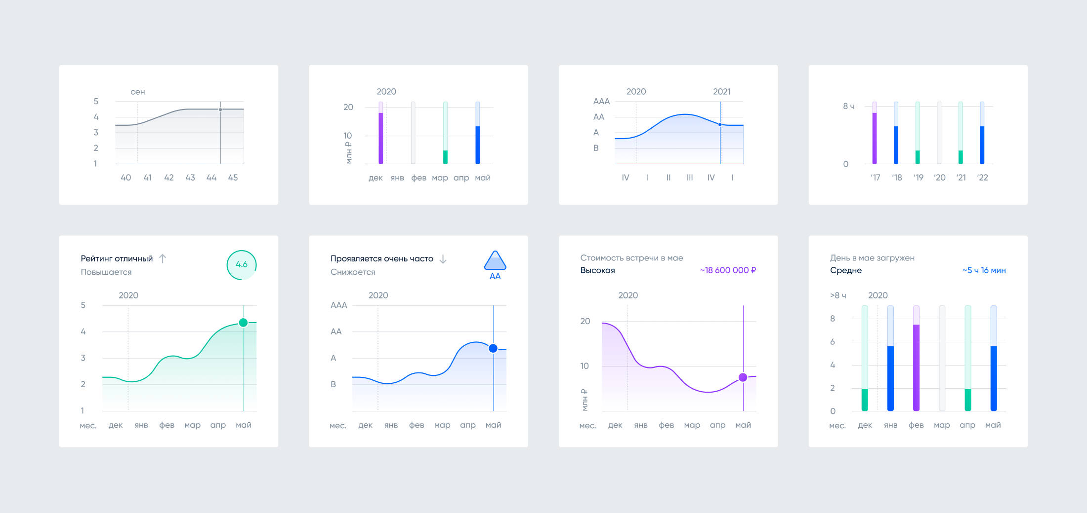 Another crucial and fascinating aspect of the UI-kit was the inclusion of graphs to visualize the statistics of human performance assessments from various perspectives. Ensuring that the information was presented accurately and aesthetically on the charts posed an analytical challenge, particularly when dealing with limited data or periods of no data. To address this, I developed a dedicated library of graphs within the UI-kit, allowing for seamless integration into layouts. The library offered flexibility in terms of scaling, adjusting the display principles, and selecting the timeline period.